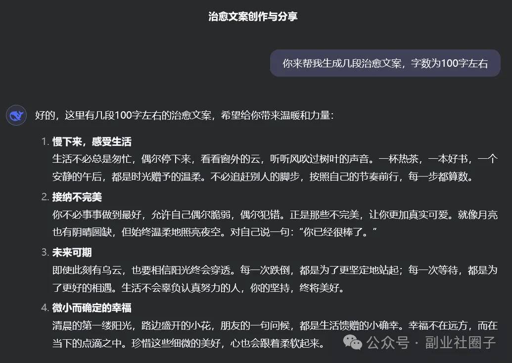 首先,让DeepSeek帮我们生成一段字数为100左右的治愈文案
